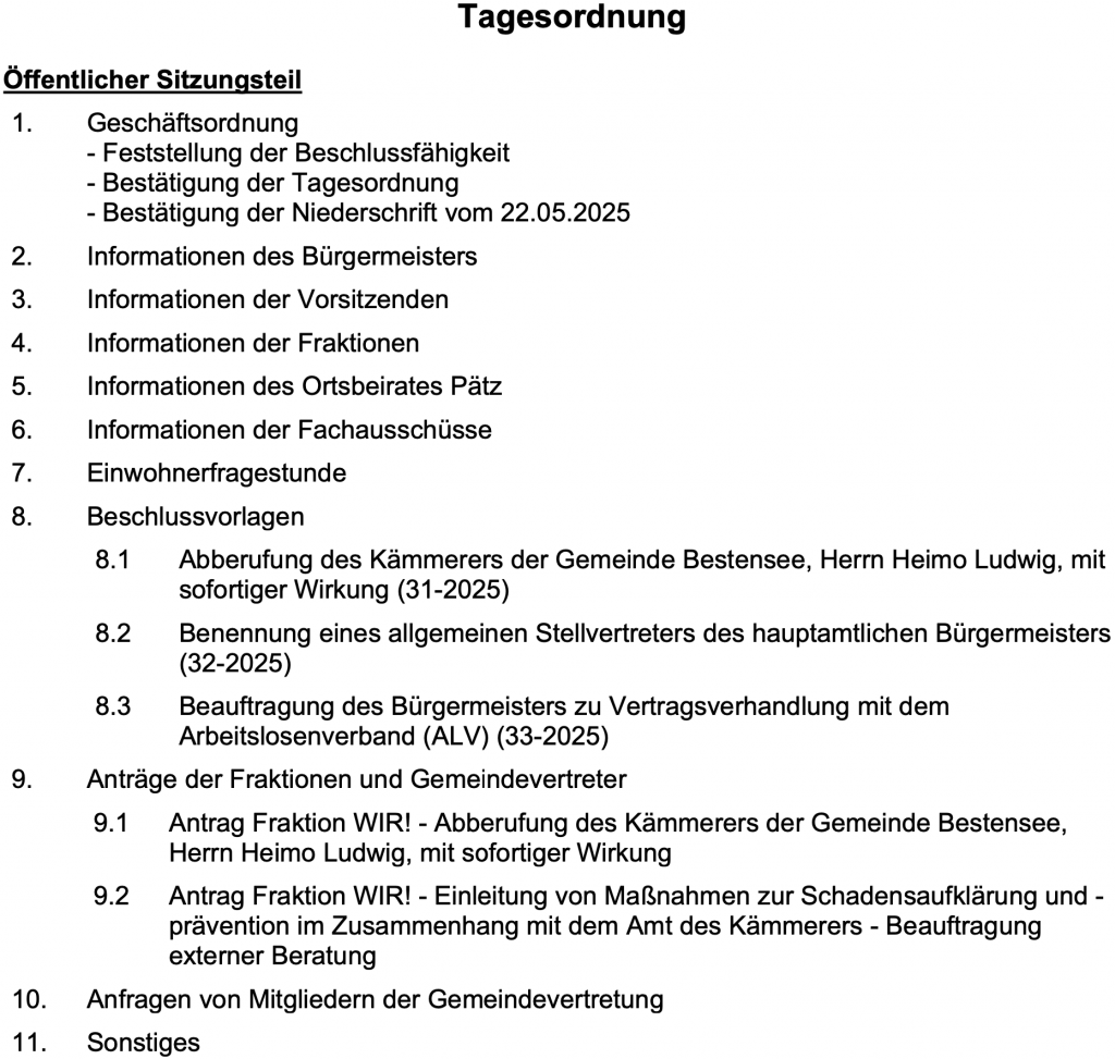 Unsere Fraktion stimmte dem Beschluss zur Abberufung des Kämmerers zu, weil wir mit diesem Amt ein hohes Maß an Vertrauen verbinden und dieses, trotz des noch nicht rechtskräftigen Urteils, beschädigt sehen. Durch die Berichterstattung in der Presse ist das Ansehen der Gemeindeverwaltung beschädigt worden. Die Gemeinde Bestensee befindet sich in einer schwierigen Haushaltssituation und benötigt Handlungsfähigkeit u. A. zum Erstellen der nächsten Haushalte. Ein Abwarten des endgültigen Prozessausgangs ist nach unserer Auffassung nicht möglich. Wir haben uns dem Beschluss des Bürgermeisters angeschlossen, um diesem die Stellenausschreibung und -vergabe zu ermöglichen. Damit sollen die Bürger des Ortes wieder eine handlungsfähige Gemeindeverwaltung bekommen. Insgesamt gab es 15 Ja-Stimmen und 3 Enthaltungen.