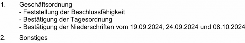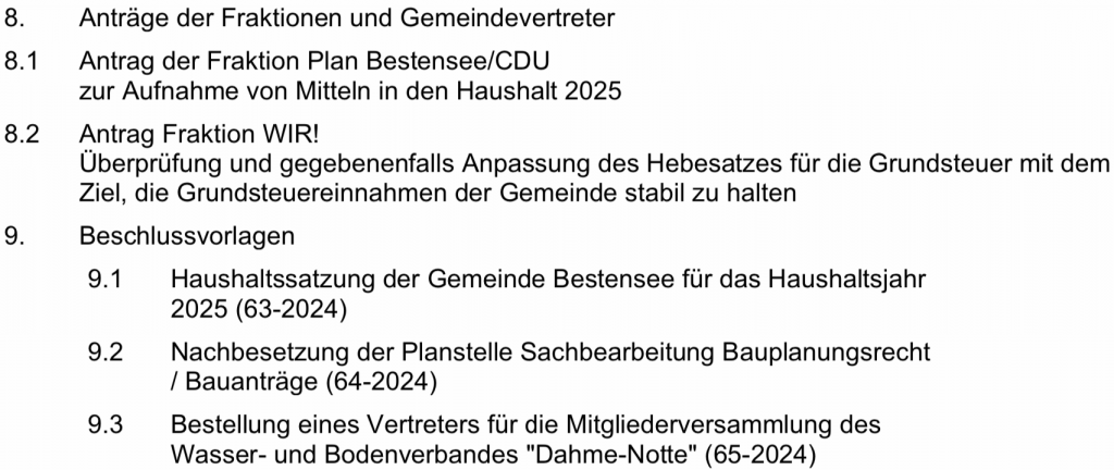 9.1 Unsere Fragen konnten kurz vorher teilweise schriftlich beantwortet werden. Dennoch liegt keine Entscheidung der Kommunalaufsicht über den Haushalt 2024 vor. Ohne diese Grundlage ist ein Haushalt 2025, aus unserer Sicht, unmöglich. Wir stimmten zweimal dagegen und einmal dafür. Die Zustimmung ergibt sich aus der Einsicht des engen Zeitplanes, der durch die Änderung der Kommunalverfassung entstand.